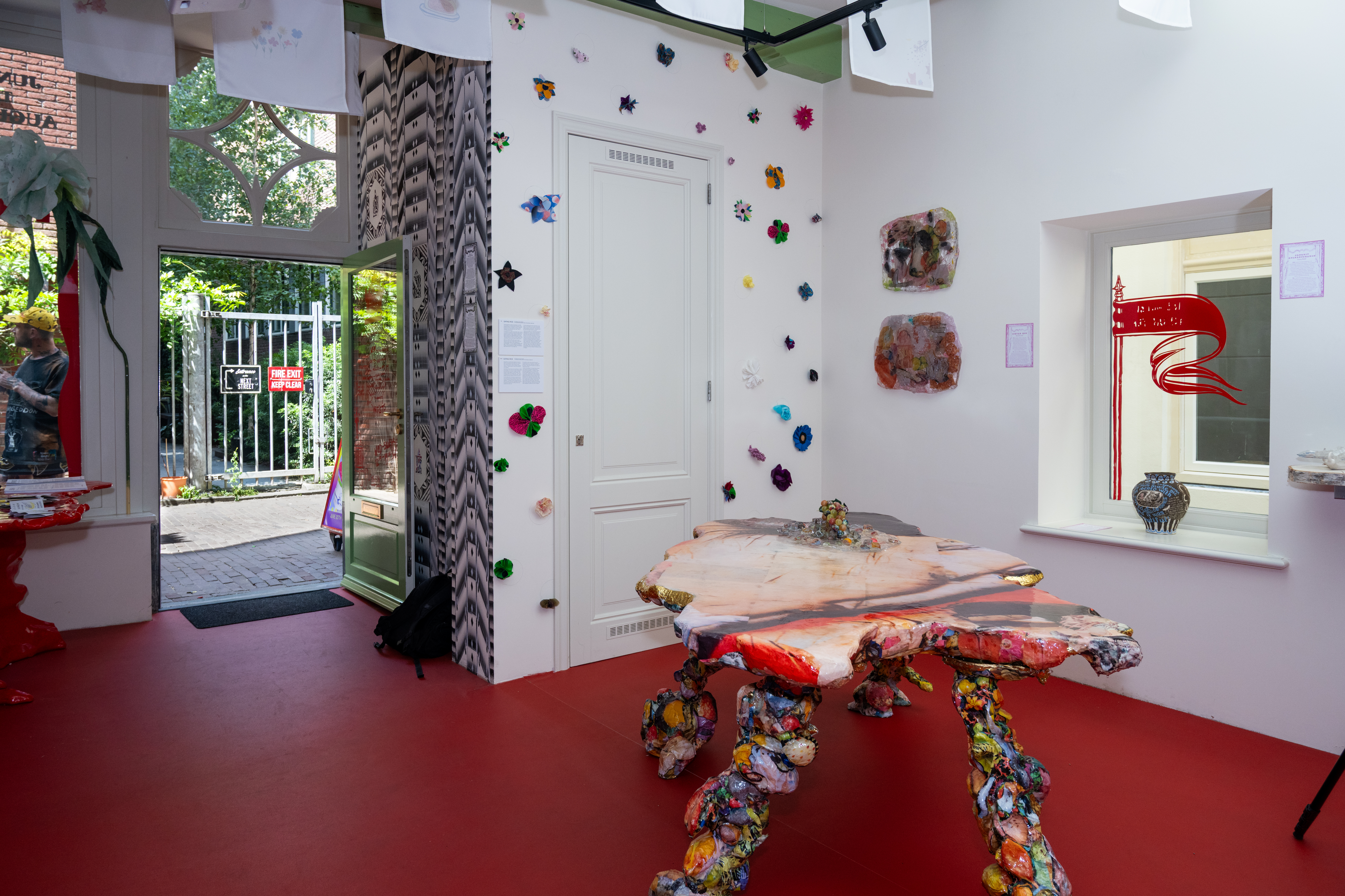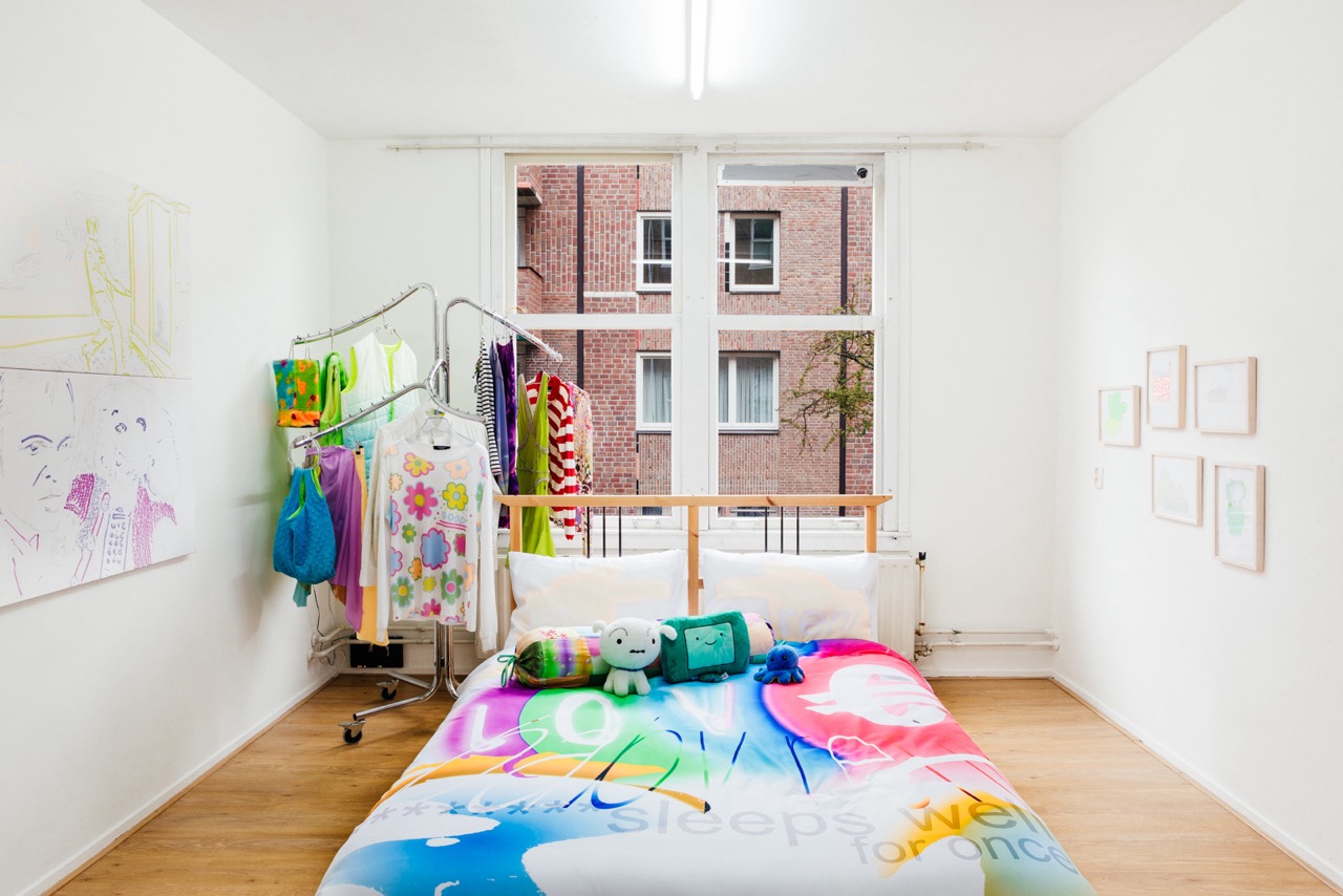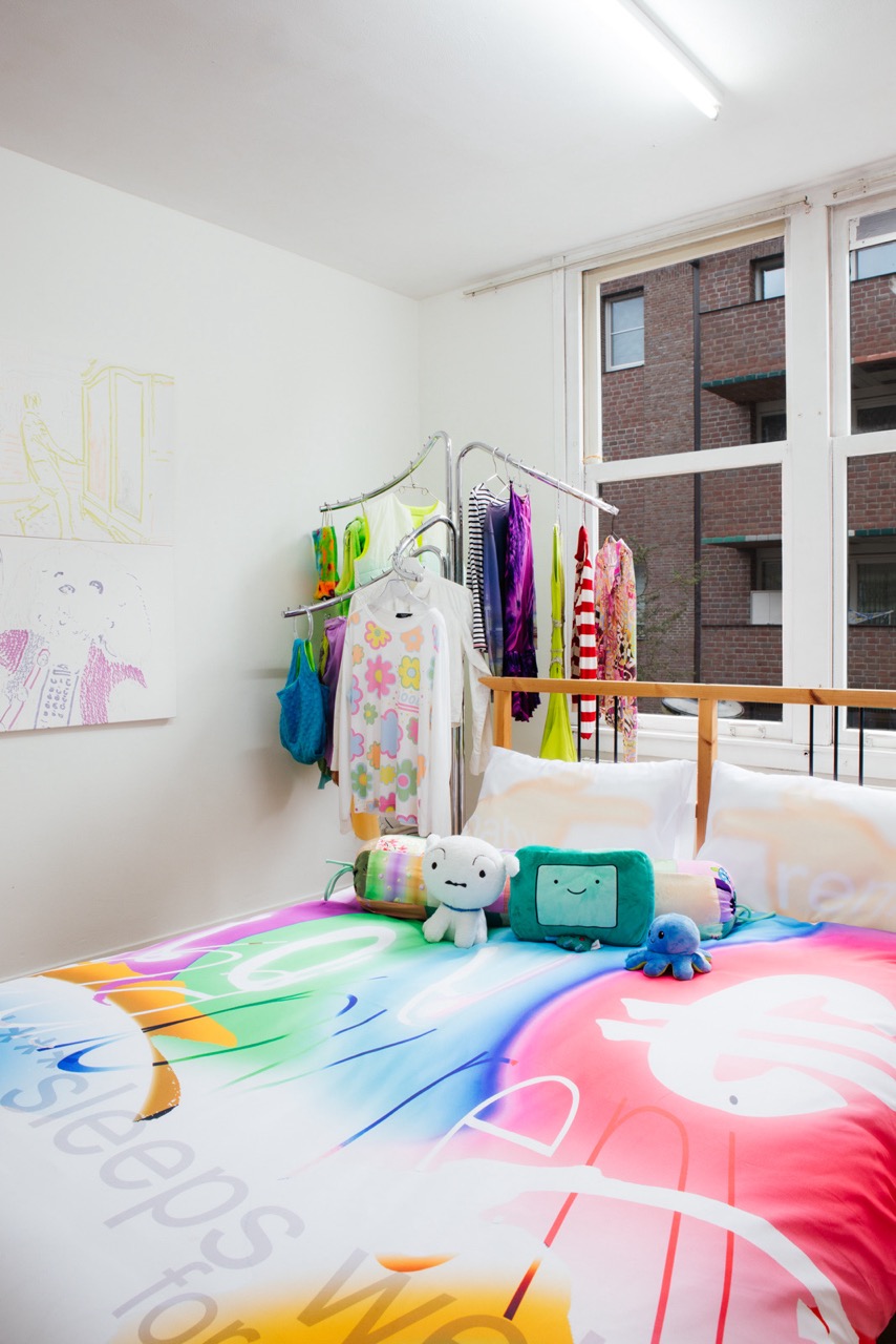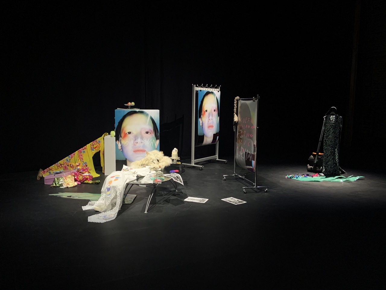 Metal, wood, polyster sheets, archive pieces of Baby Reni and Lily van der Stokker “Good” t-shirt, stuffed animals