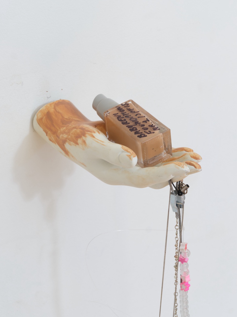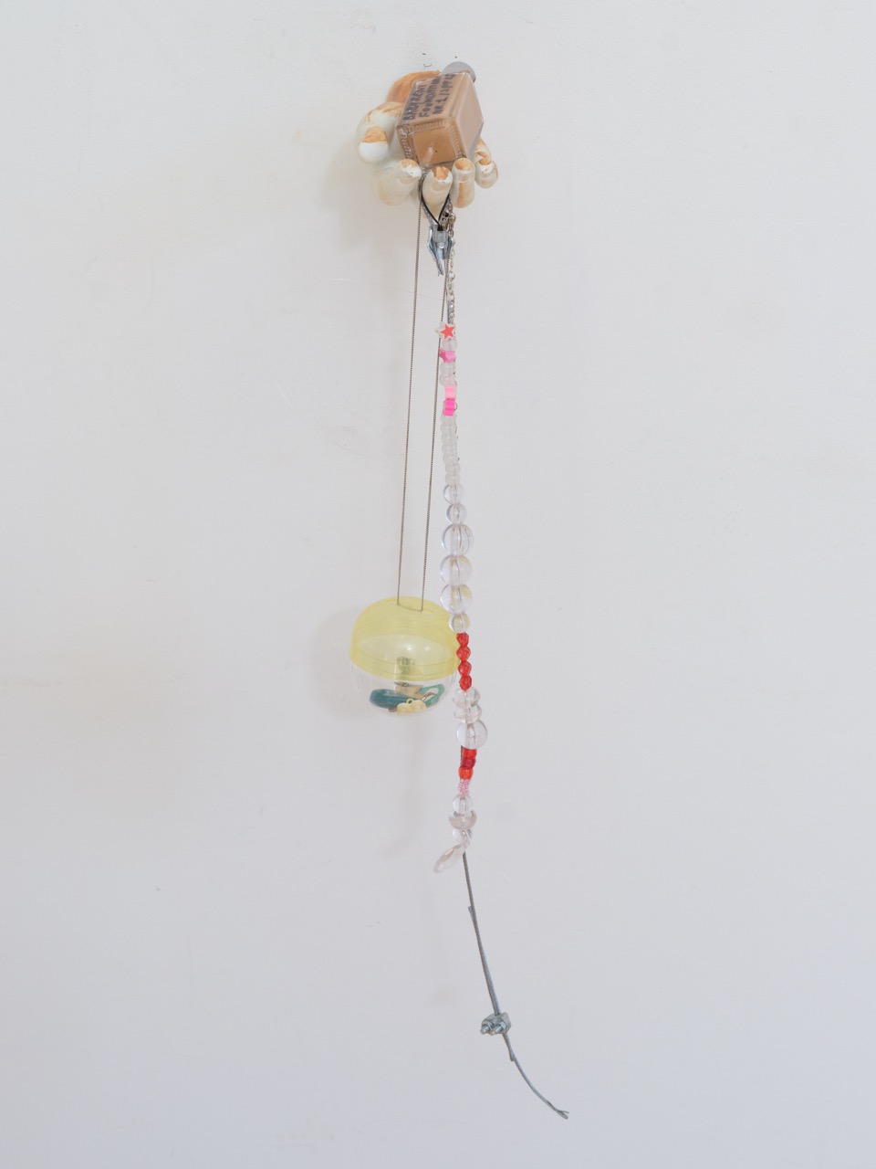 Mannequin hand, glass bottle, plastic toy, silver chain, steel wire, beads, jade ring