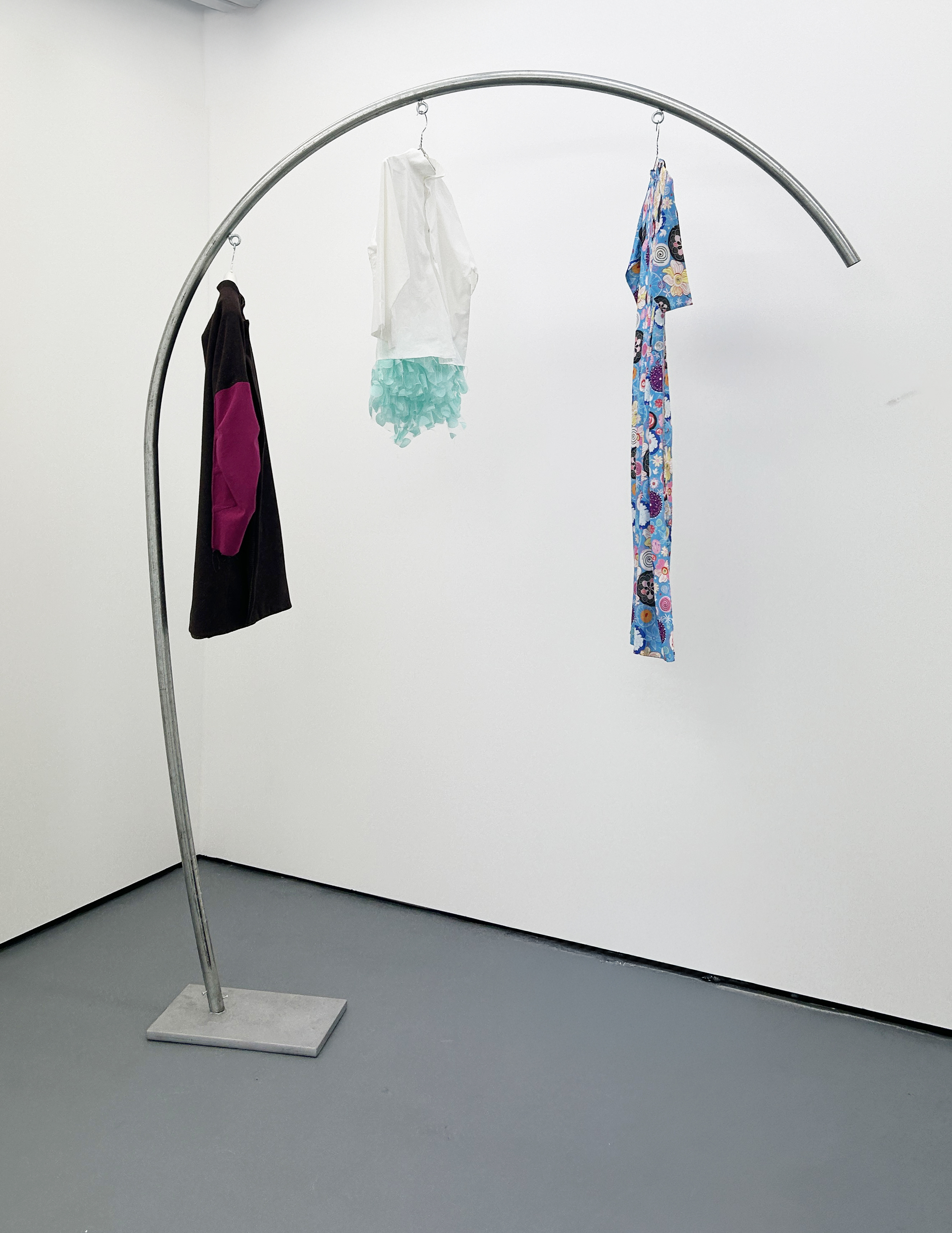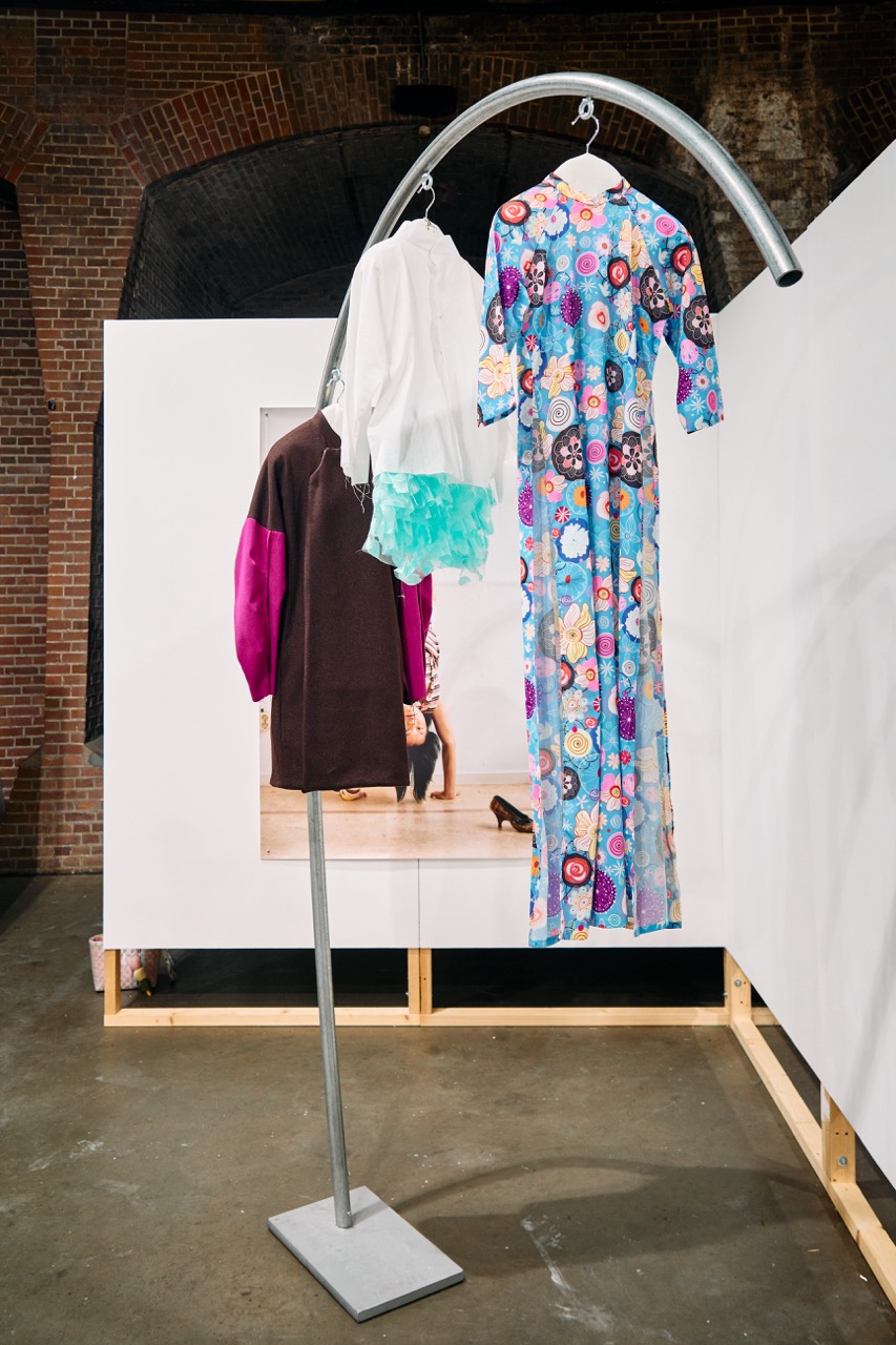 Steel, metal, clothing hangers, wool jacket, cotton shirt, ruffle underwear, polyester Ao Dai, Tyvek dress, Acrylic painting on silk, cotton Ao Dai