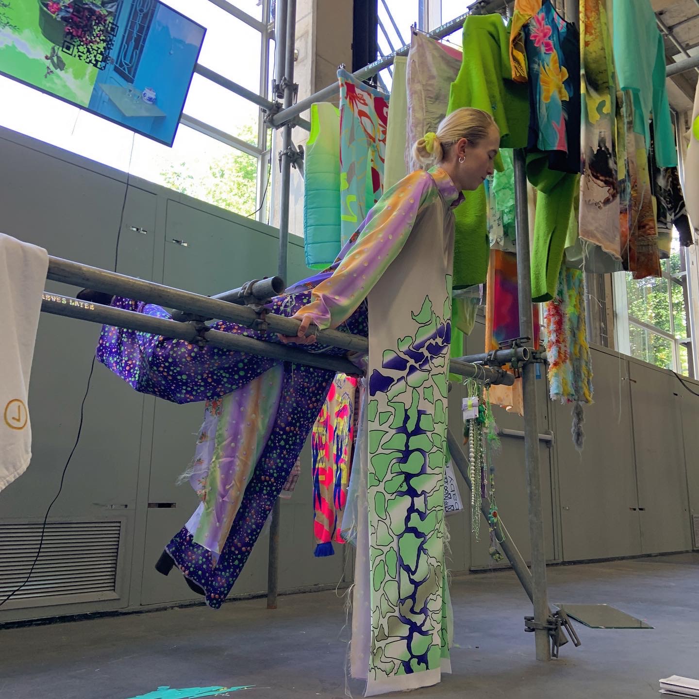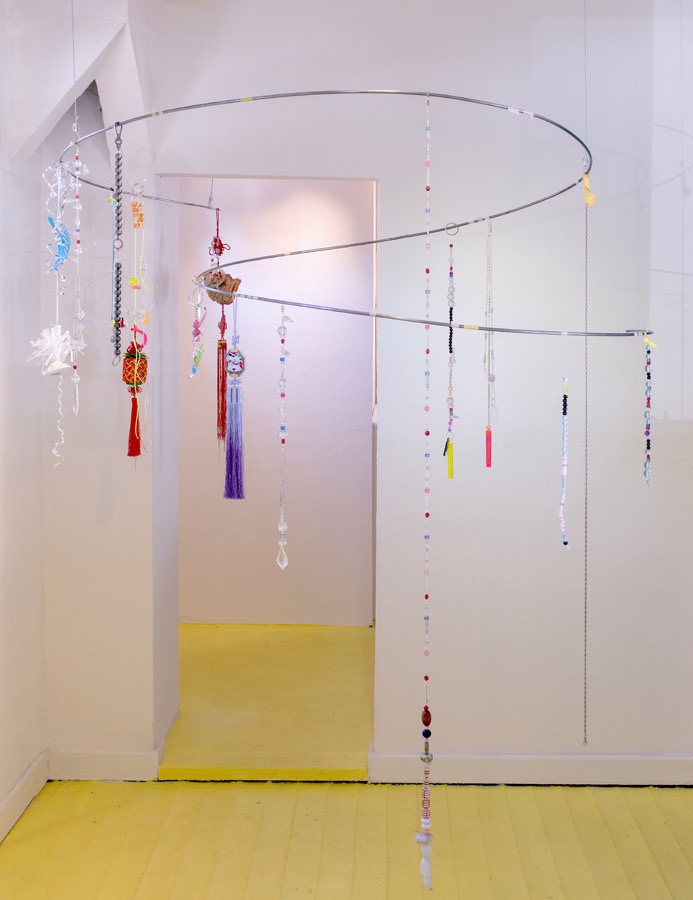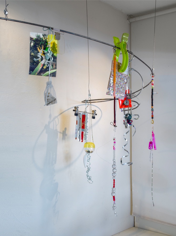 Scaffolding, Jetlegged collection, epoxy, helium balloons, tl-light, stickers, plastic, paper, tv-screen, mirror, trinkets