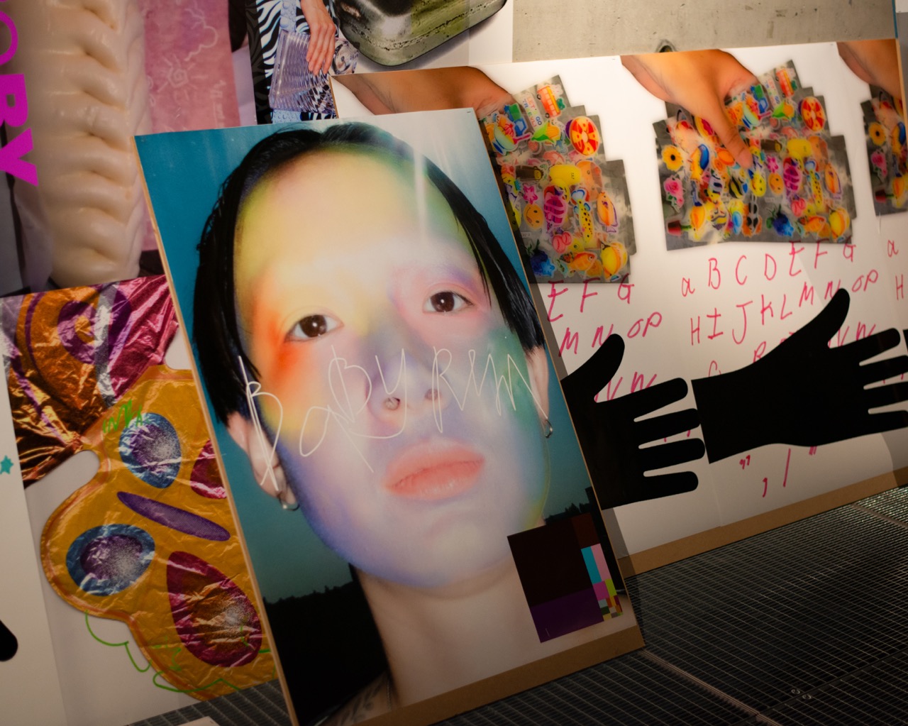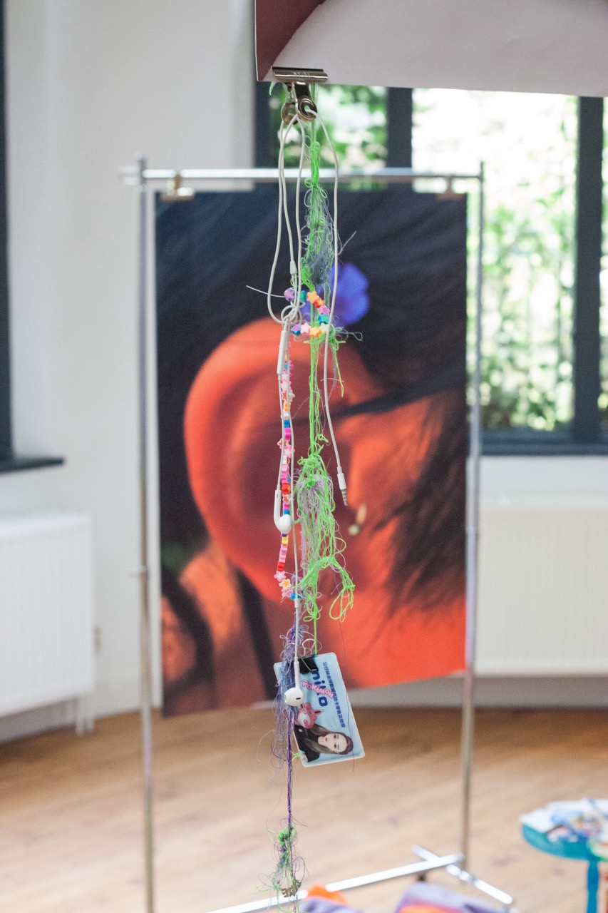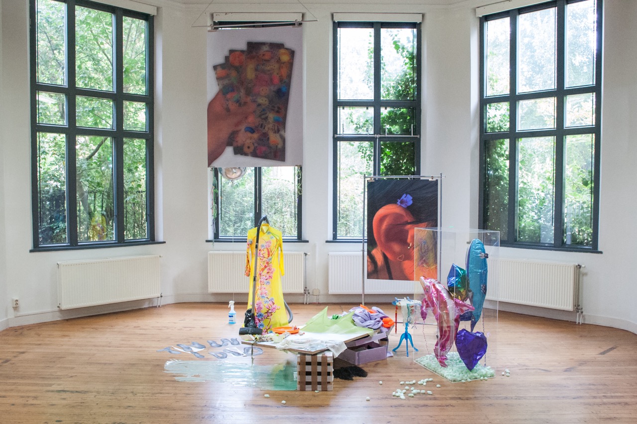 Ink-jet print on matt paper, charcoal drawing on paper, textile, vacuum machine, epoxy bubble tea spill, plastic, plexiglass, helium baloons, fur,wood, tape, trinkets, thread, headphones