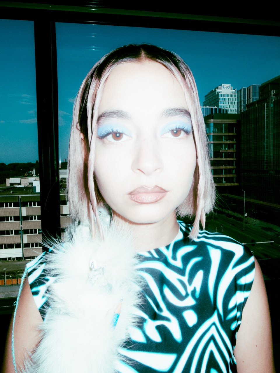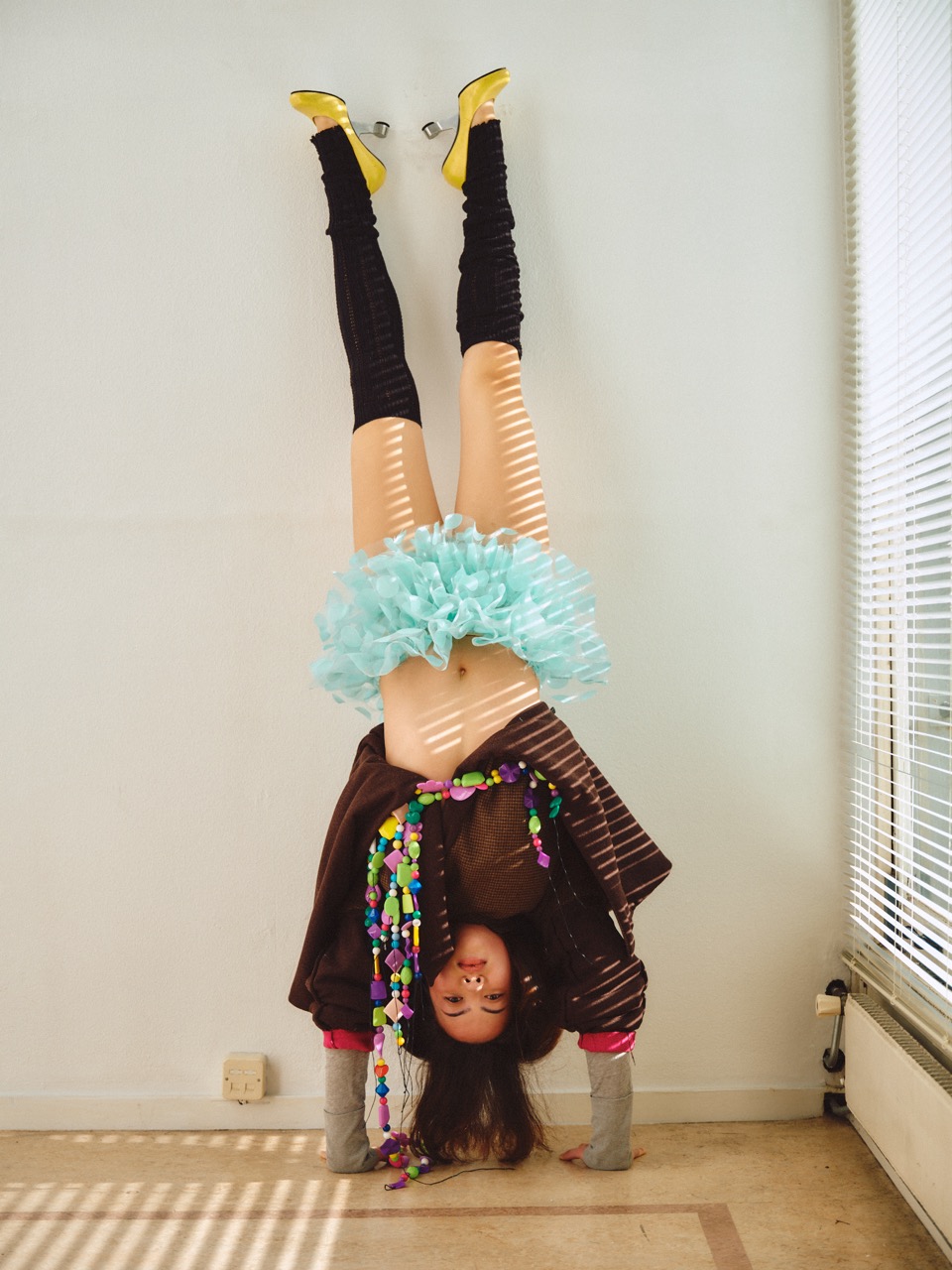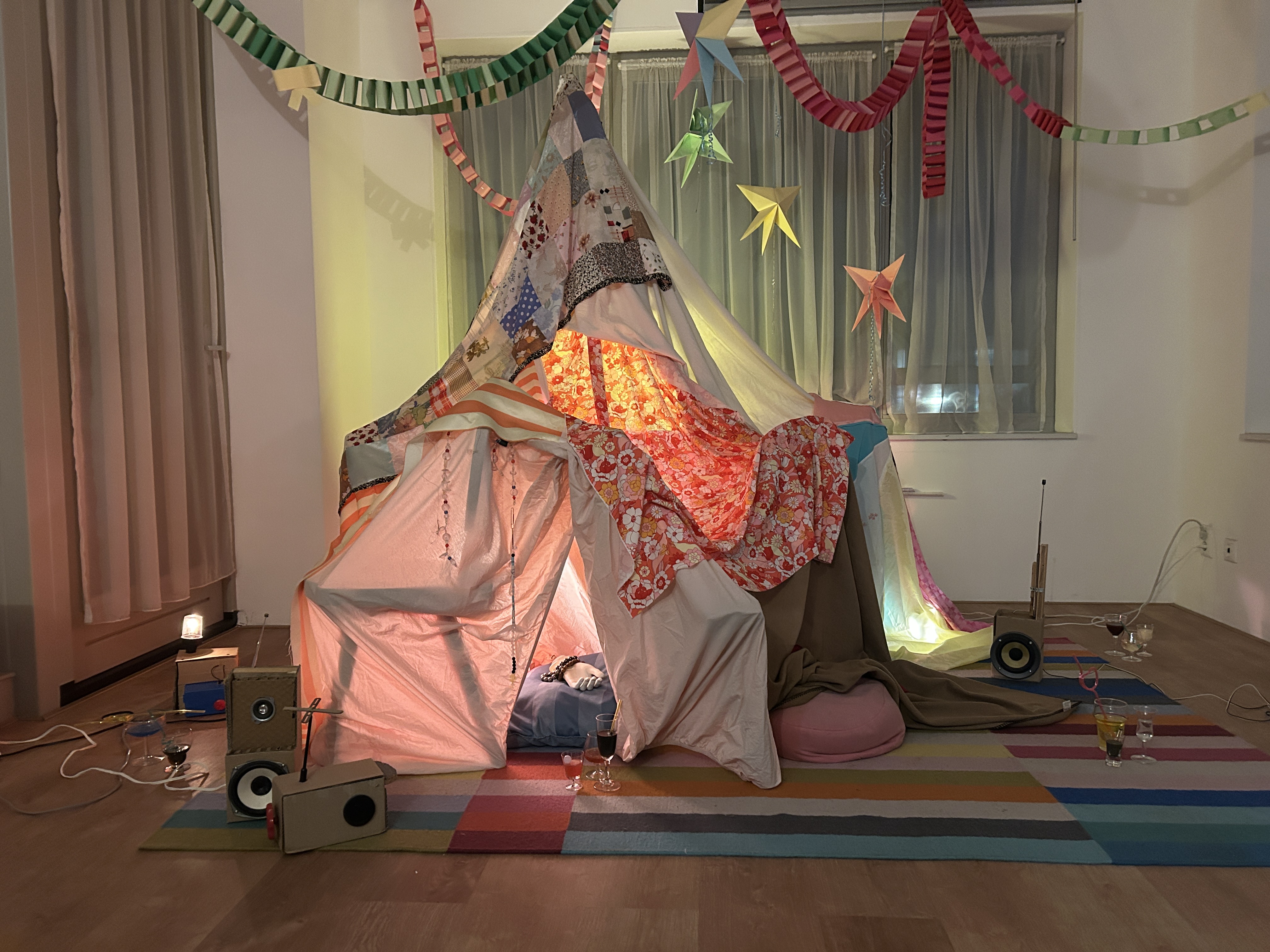 Ink-jet print on matt paper, charcoal drawing on paper, textile, vacuum machine, epoxy bubble tea spill, plastic, plexiglass, helium baloons, fur,wood, tape, trinkets, thread, headphones