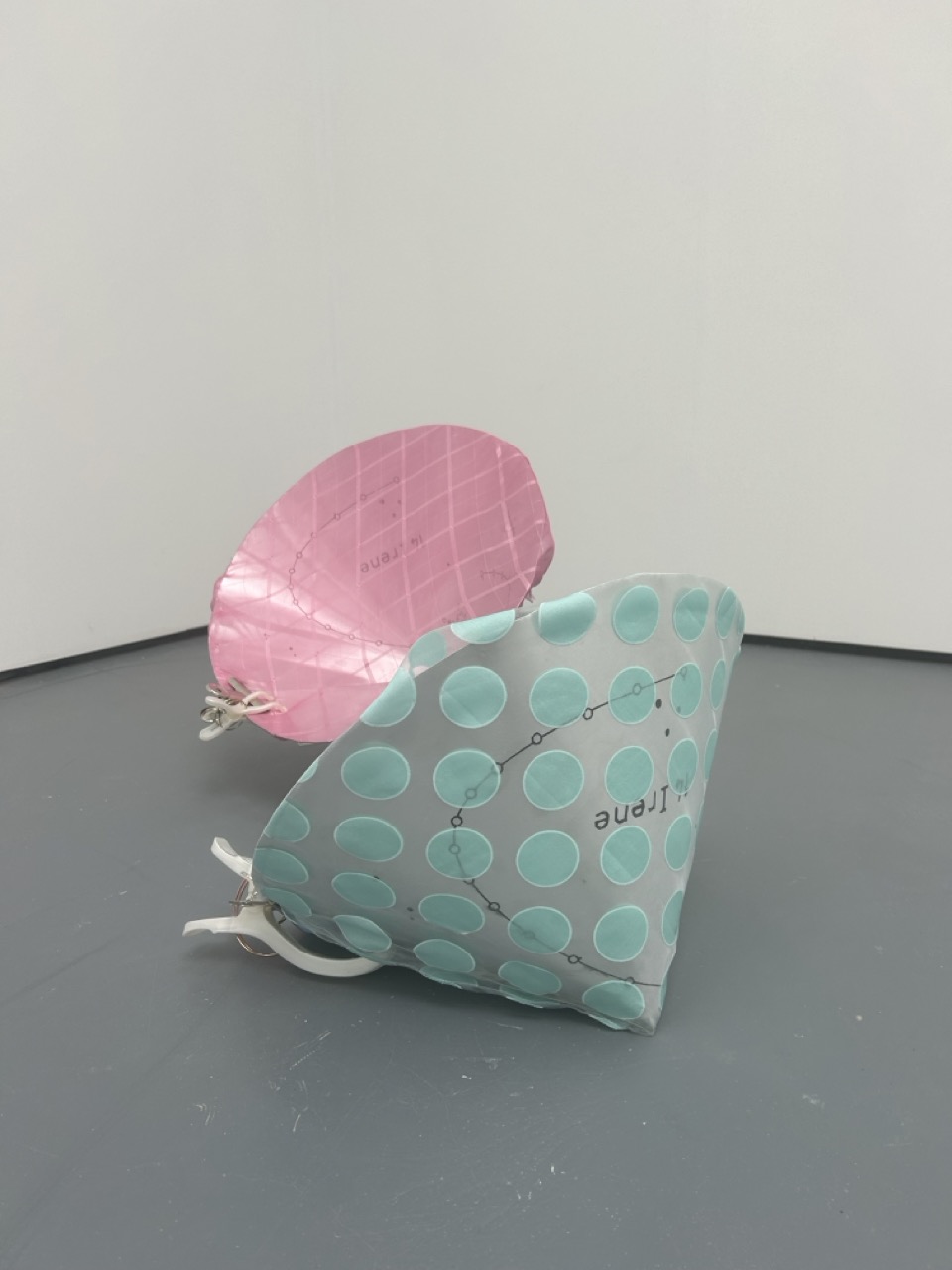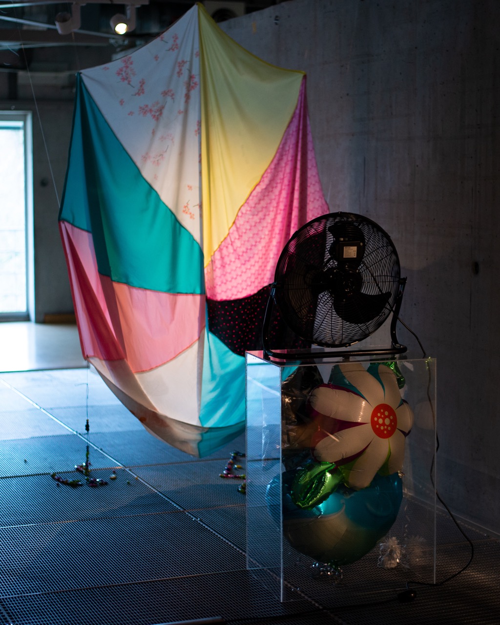 Plexiglass, helium balloons, ventilator, parachute made out of reused fabrics, inkjet print on glossy paper, wood