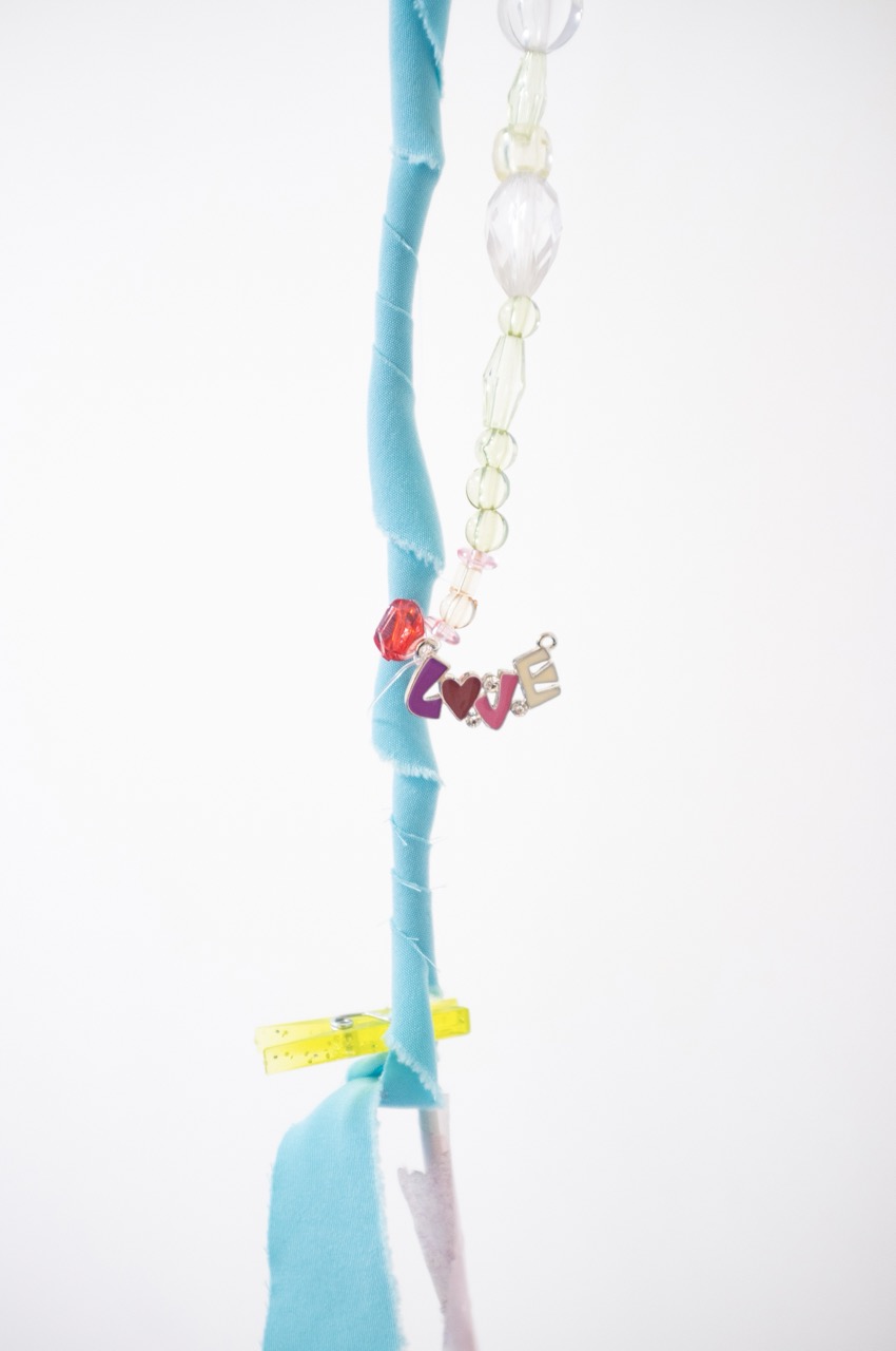 iPhone charger, plastic beads, tape, silk