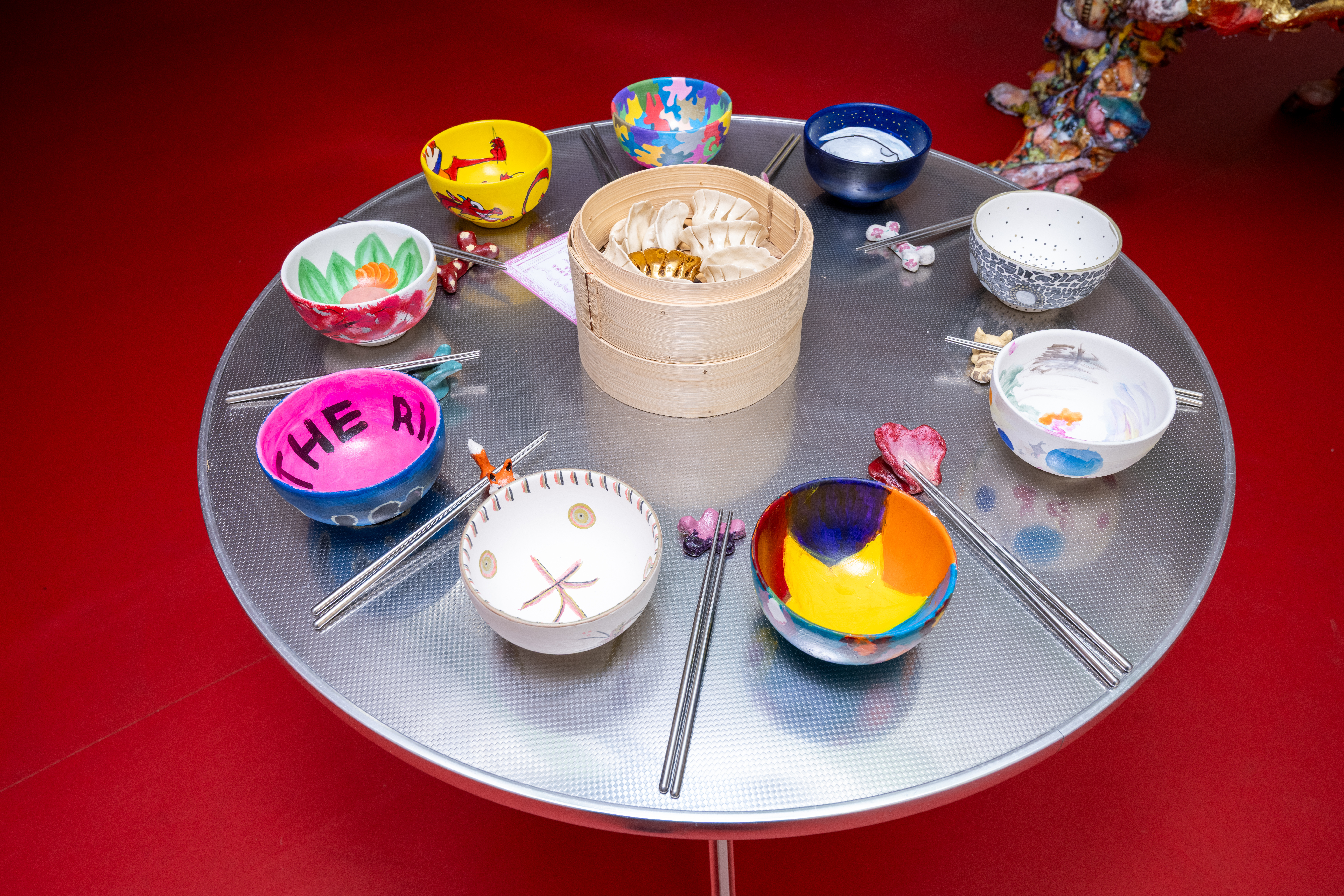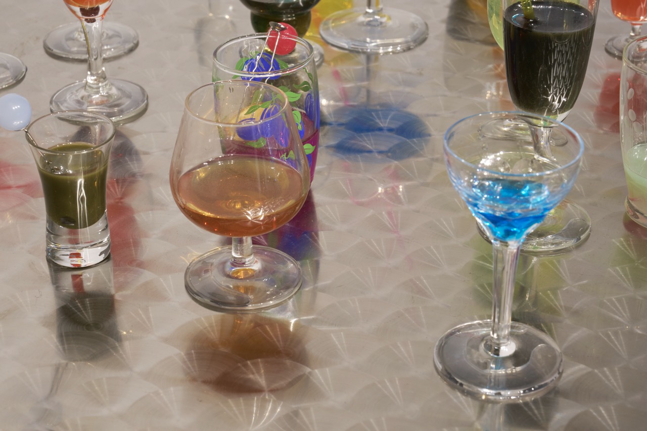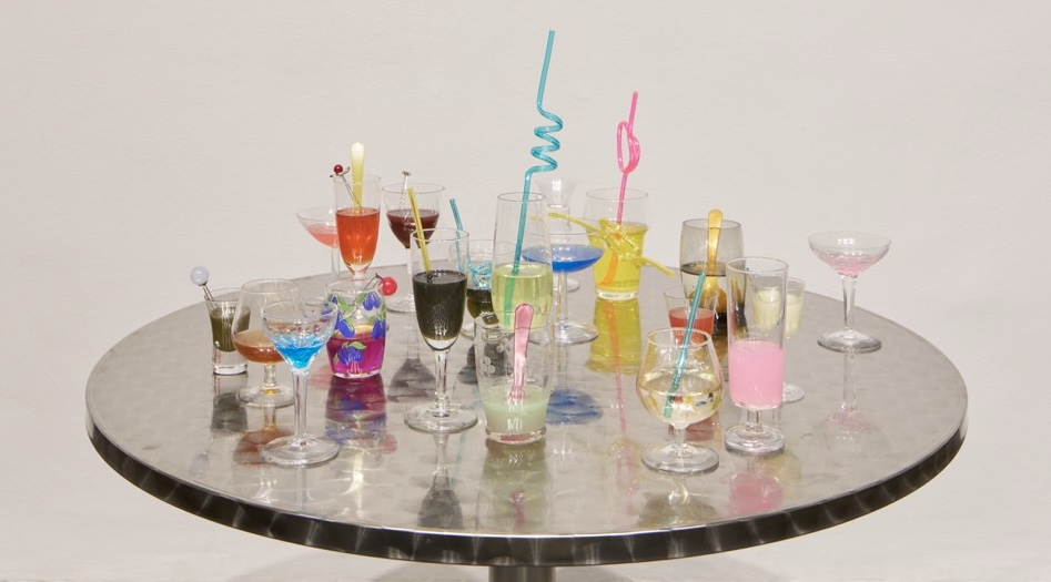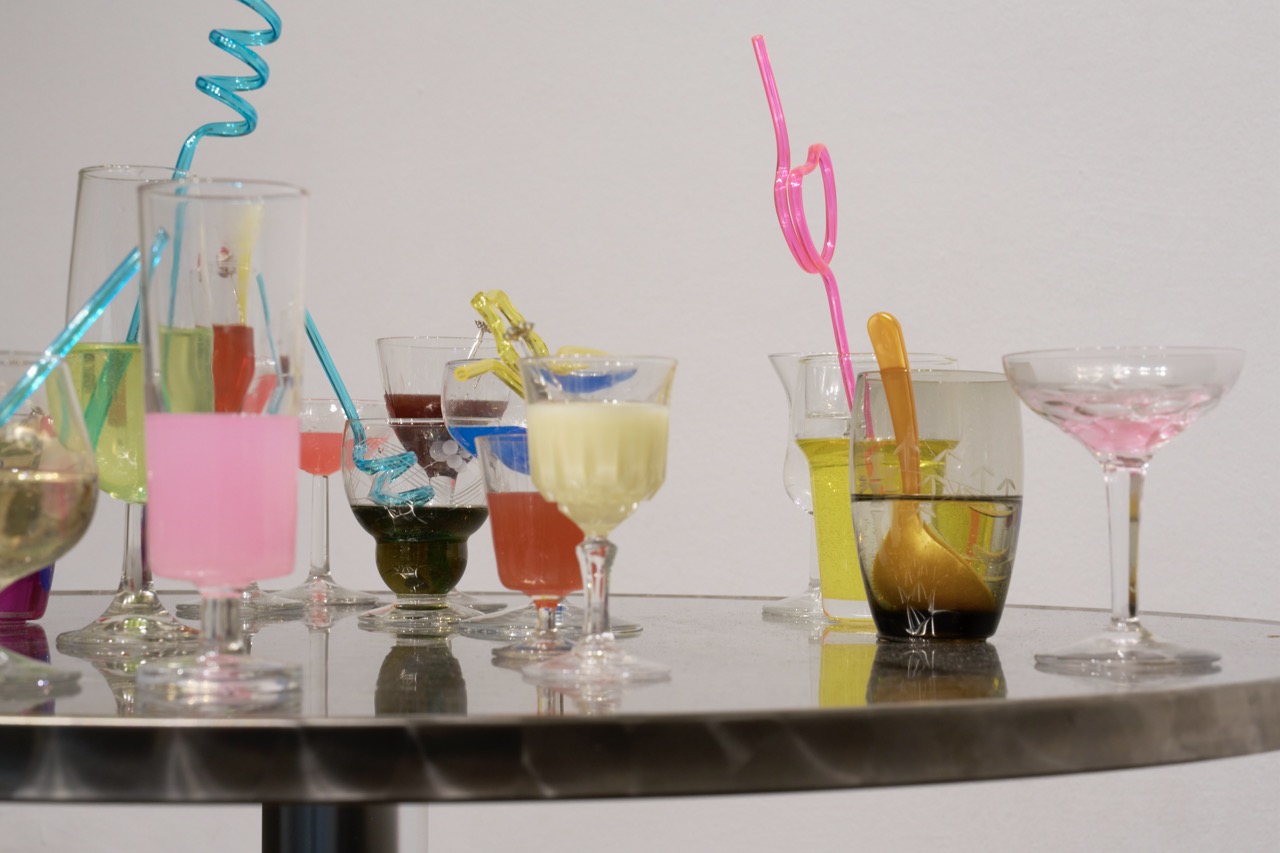 Glasses, RVS table, resin, plastic straws and spoons, hair clips