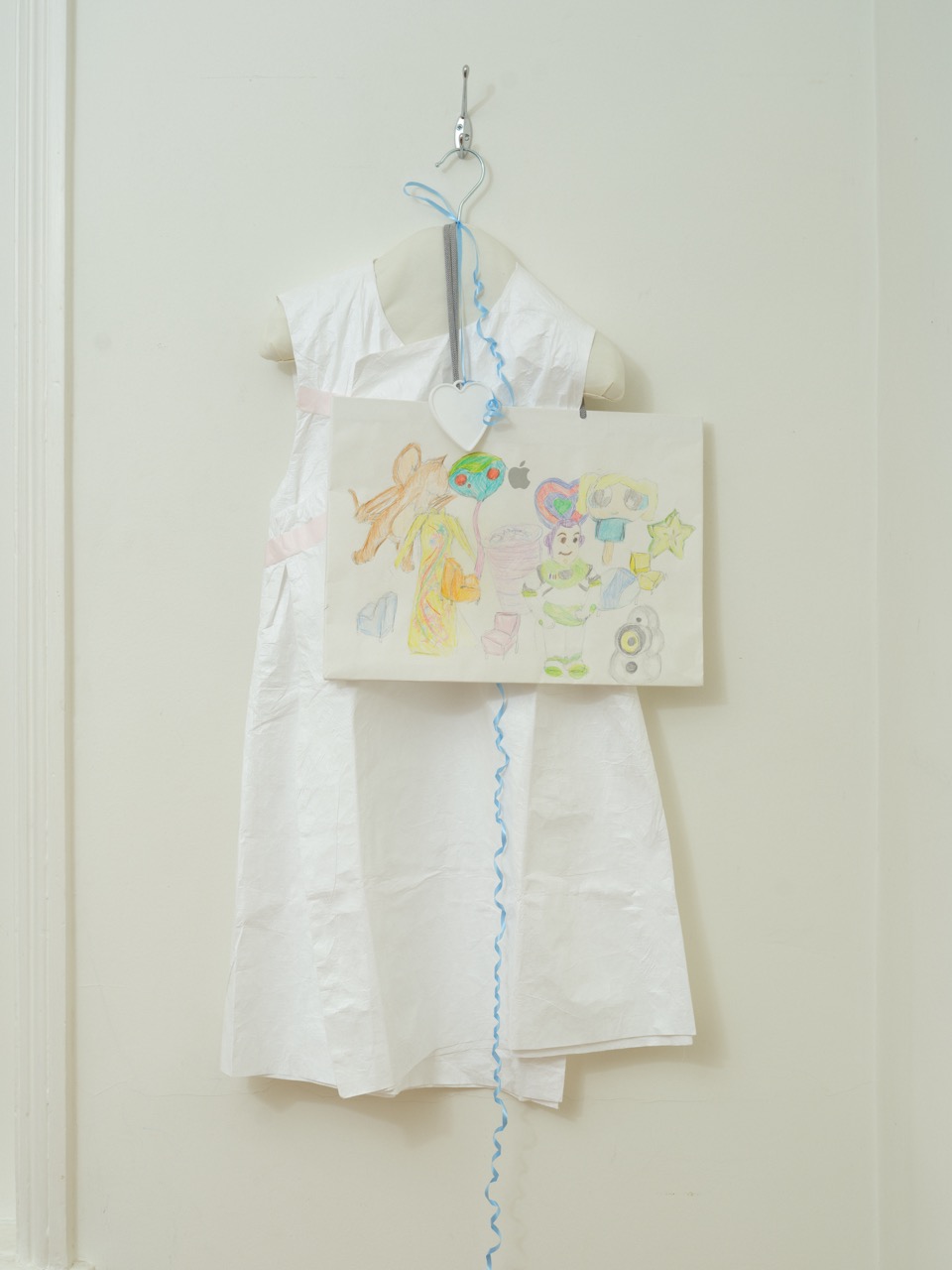 Paper dress, tape, ribbon, plastic heart, padded clothing hanger, pencil drawing on Apple shopping bag